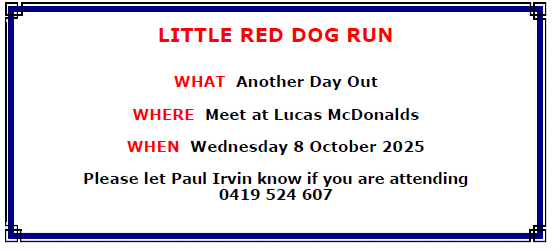LITTLE RED DOG RUN – SEPTEMBER WHAT Another Day Out WHERE Meet at Lucas McDonalds WHEN Wednesday 10th September TIME: 9.30am Please let Paul Irvin know if you are attending 0419 524 607