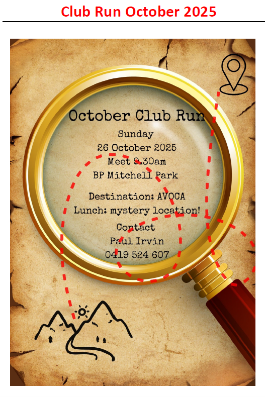 SAVE THE DATE – CLUB RUN – OCTOBER WHEN: Sunday the 26th of October TIME: Depart 9.30am MEET WHERE: Mitchell Park BP Service Station Learmonth Road WHAT: Mystery Destination RSVP: Paul Irving 0419 524 607
