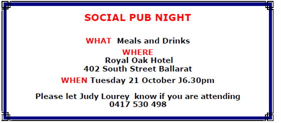 SOCIAL PUB NIGHT – ROYAL OAK HOTEL WHAT: Meal and Drinks WHERE: 402 South Street Ballarat WHEN: Tuesday 16th September 6.30pm Please let Judy Lourey know if you are attending 0419 524 607
