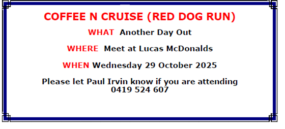 COFFEE N CRUISE (RED DOG RUN) – OCTOBER WHAT Another Day Out WHERE Meet at Lucas McDonalds WHEN Wednesday 29th October TIME: 9.30am Please let Paul Irvin know if you are attending 0419 524 607
