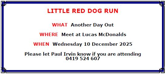 LITTLE RED DOG RUN – DECEMBER WHAT Another Day Out WHERE Meet at Lucas McDonalds WHEN Wednesday 10th DECEMBER TIME: 9.30am Please let Paul Irvin know if you are attending 0419 524 607