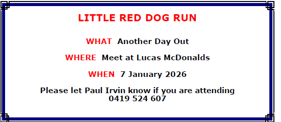LITTLE RED DOG RUN – JANUARY WHAT Another Day Out WHERE Meet at Lucas McDonalds WHEN Wednesday 7th JANUARY TIME: 9.30am Please let Paul Irvin know if you are attending 0419 524 607