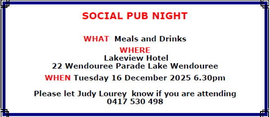 SOCIAL PUB NIGHT – LAKEVIEW HOTEL WHAT: Meal and Drinks WHERE: 22 Wendouree Pde Wendouree WHEN: Tuesday 16th December 6.30pm Please let Judy Lourey know if you are attending 0419 524 607
