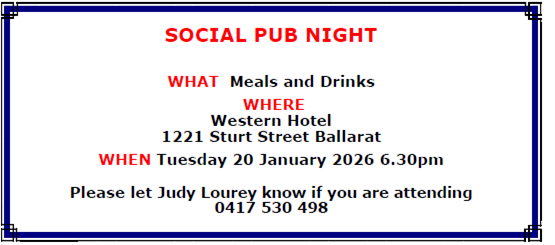 SOCIAL PUB NIGHT – WESTERN HOTEL WHAT: Meal and Drinks WHERE: 1221 Sturt Street Ballarat WHEN: Tuesday 20th January 6.30pm Please let Judy Lourey know if you are attending 0419 524 607