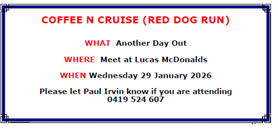 COFFEE N CRUISE (RED DOG RUN) – JANUARY WHAT Another Day Out WHERE Meet at Lucas McDonalds WHEN Wednesday 28th JANUARY TIME: 9.30am Please let Paul Irvin know if you are attending 0419 524 607