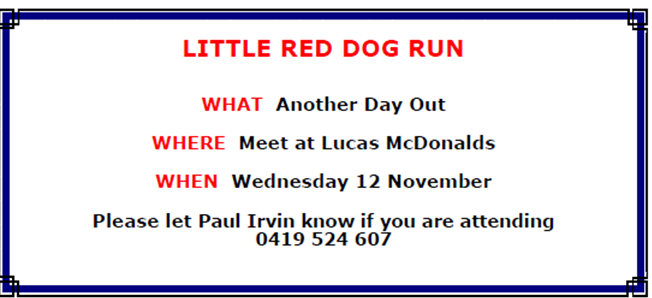 LITTLE RED DOG RUN – NOVEMBER WHAT Another Day Out WHERE Meet at Lucas McDonalds WHEN Wednesday 12th NOVEMBER TIME: 9.30am Please let Paul Irvin know if you are attending 0419 524 607