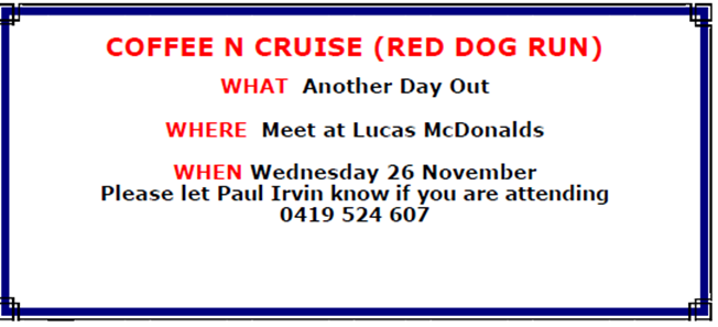 COFFEE N CRUISE (RED DOG RUN) – NOVEMBER WHAT Another Day Out WHERE Meet at Lucas McDonalds WHEN Wednesday 26th NOVEMBER TIME: 9.30am Please let Paul Irvin know if you are attending 0419 524 607
