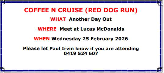 COFFEE N CRUISE (RED DOG RUN) – FEBRUARY WHAT Another Day Out WHERE Meet at Lucas McDonalds WHEN Wednesday 25th FEBRUARY TIME: 9.30am Please let Paul Irvin know if you are attending 0419 524 607